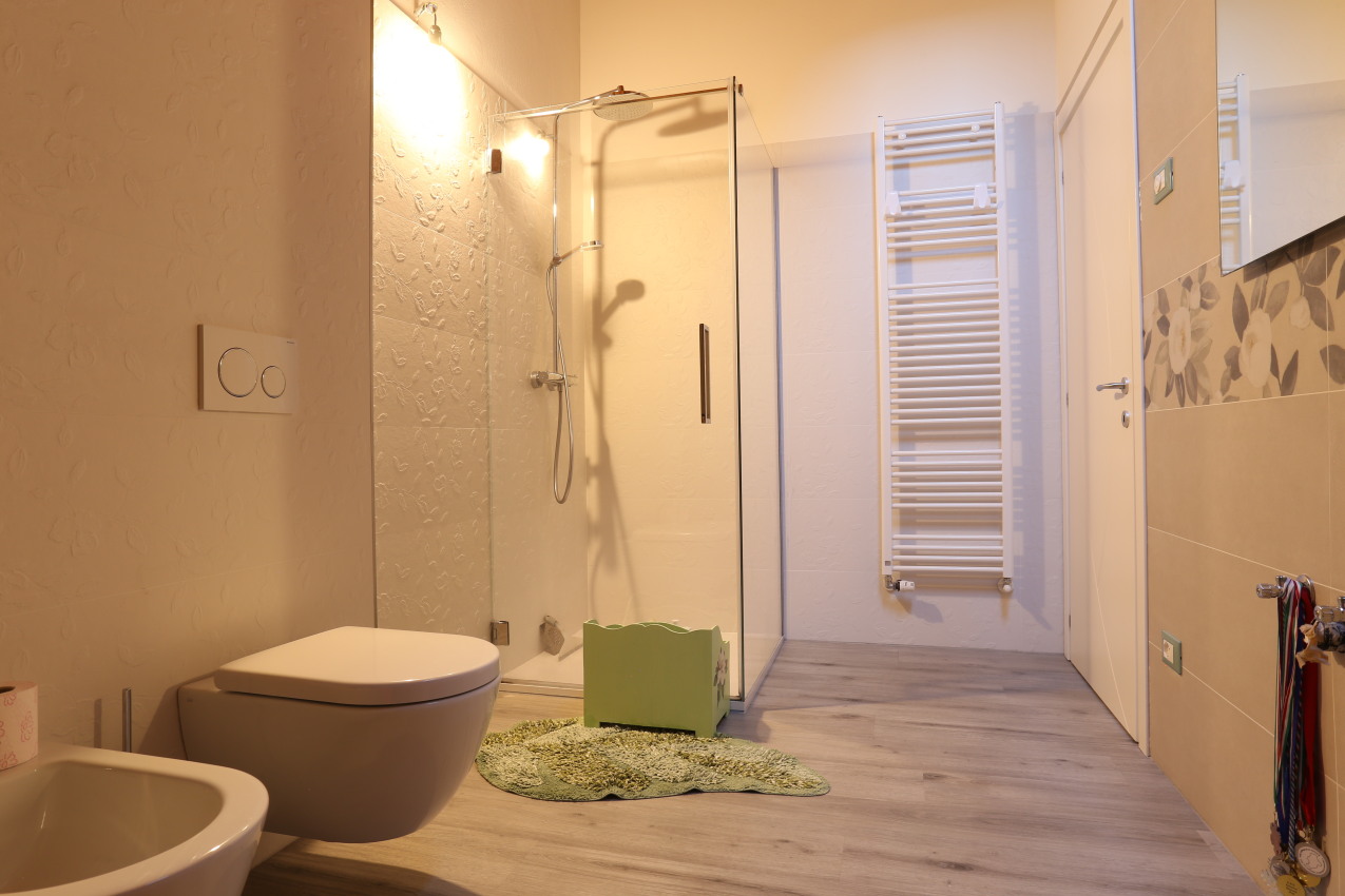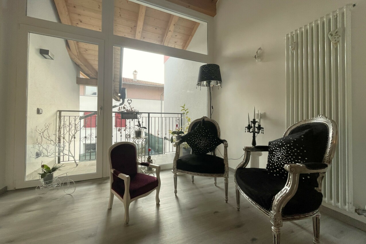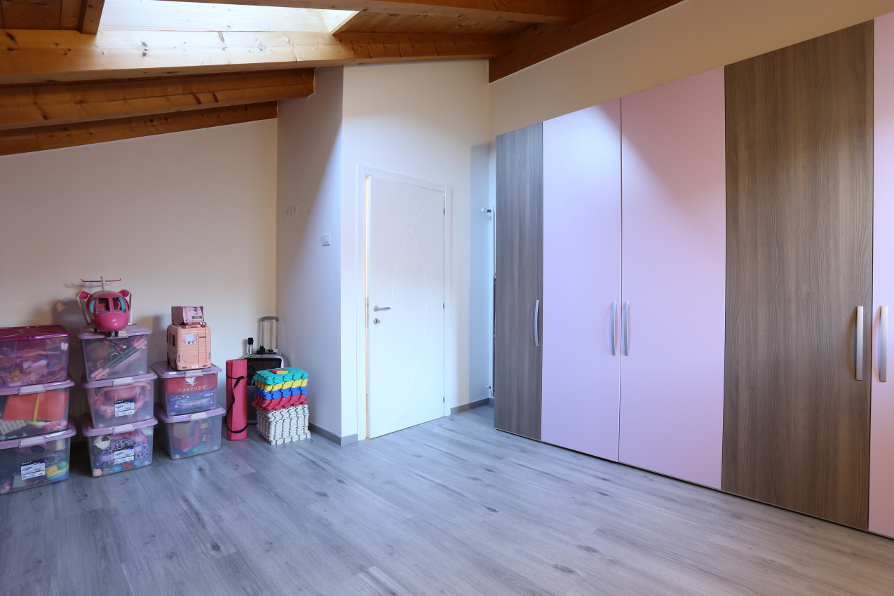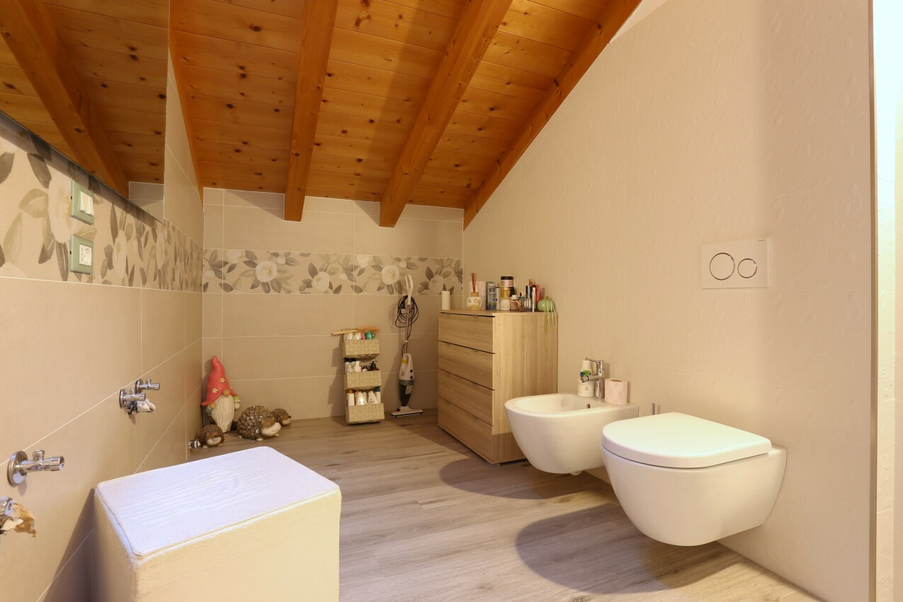 Al livello superiore, mansardato con travi a vista, si trovano due ampie stanze di 21 e 18 mq e un bagno padronale molto grande, completo di doccia e vasca, ideale per creare una zona notte raffinata o ambienti multifunzionali.